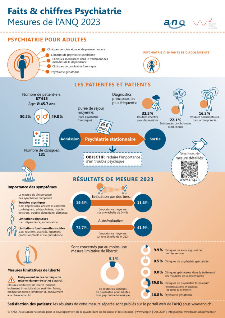 En psychiatrie pour adultes, le nombre de cas est passé de 86’497 en 2022 à 87’615 en 2023, et en psychiatrie d’enfants et d’adolescents de 4’950 à 5’070. Dans les deux domaines, les troubles affectifs (p. ex. dépressions) constituaient le diagnostic principal le plus fréquent. Les résultats des mesures de l’ANQ peuvent également être consultés sur le portail web de l’ANQ sous forme de comparaison nationale par clinique.