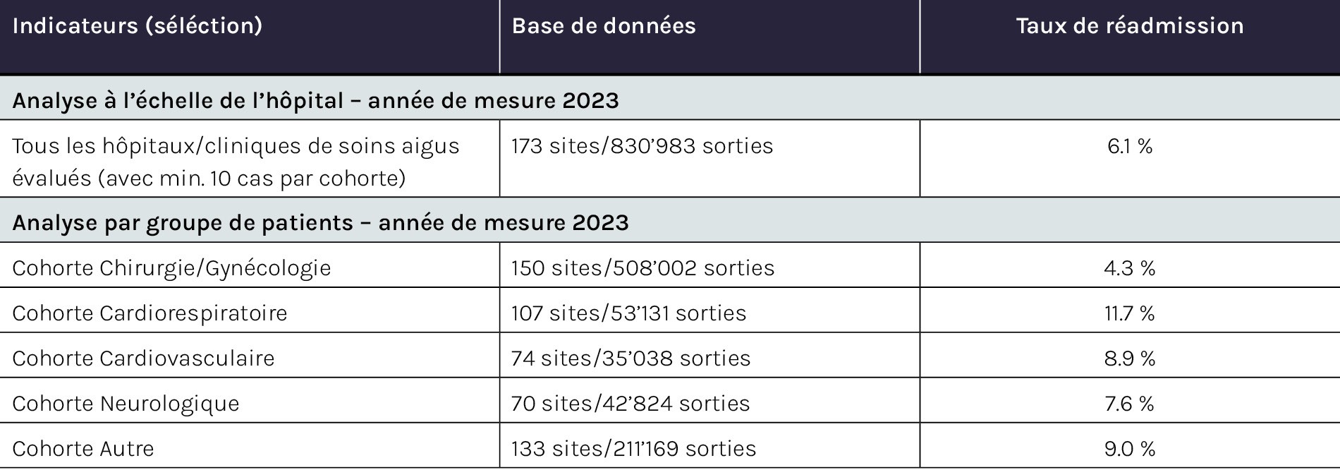 En raison des différences dans le déroulement des traitements, les taux de réadmission varient selon les groupes de patient-e-s. Les cohortes médicales ont tendance à présenter des taux plus élevés que les cohortes chirurgicales.