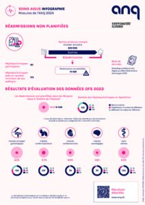 - Résultats de la mesure 2023 de l’ANQ des réadmissions non planifiées : Page d’accueil avec graphiques en ligne, rapport comparatif national et infographie.